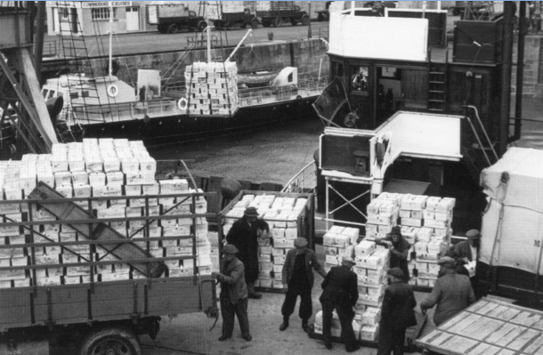 Tomatoes in chip baskets being loaded onto the mailboat in 1961